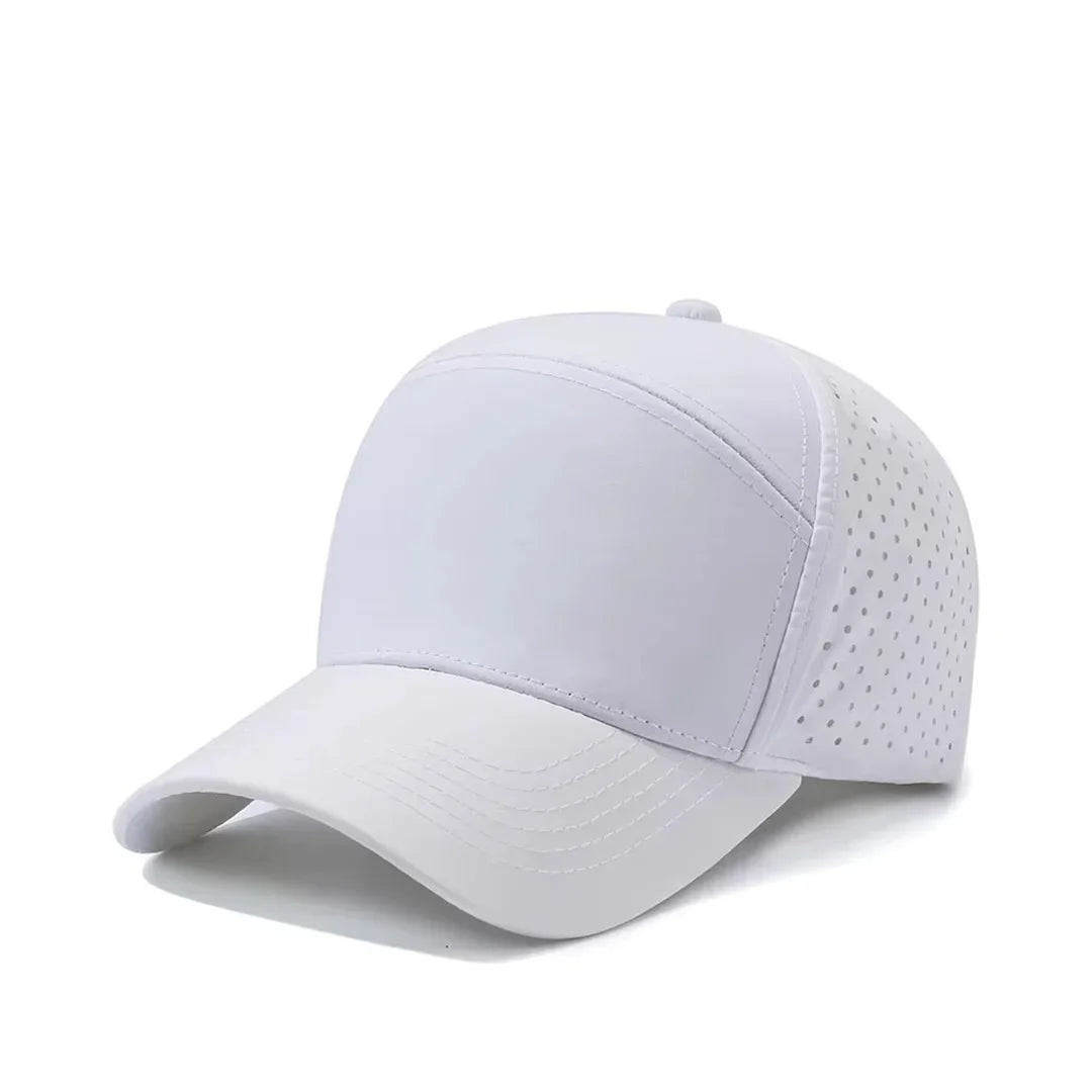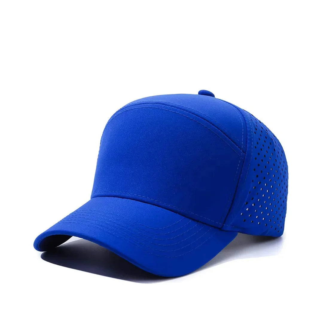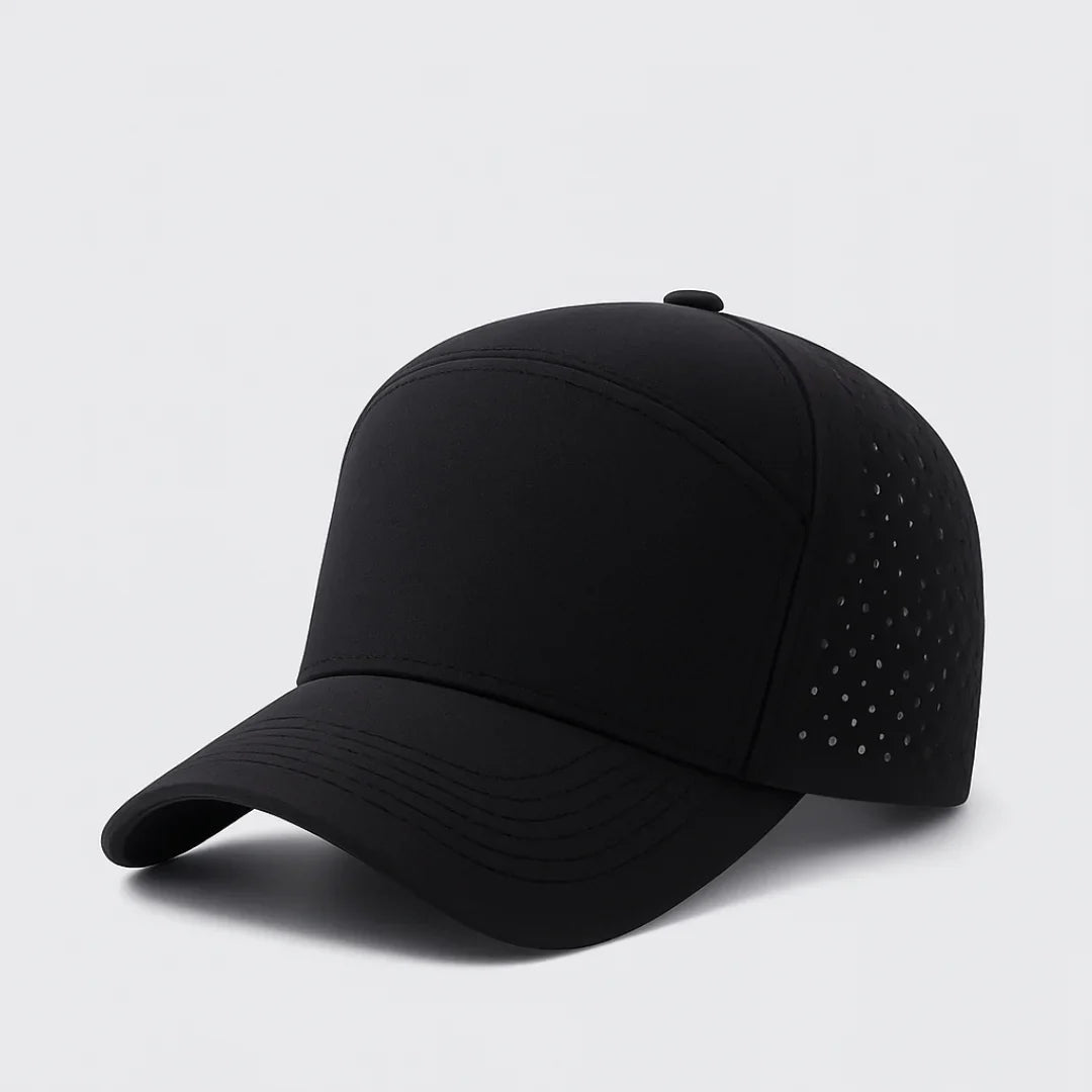 Custom embroidered waterproof running hat with quick dry fabric and laser perforations. Perfect for golf, baseball, and all-day outdoor comfort.