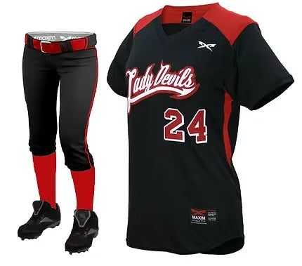 Flicker V-Neck Jerseys and Speed or Edge Softball Pant. Uniform Includes all decoration; tackle-twill sewn on or full sublimation. Includes team name, front number, back number and piping.