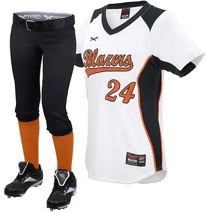 H4 V-Neck Jerseys and Speed or Edge Softball Pant. Uniform Includes all decoration; tackle-twill sewn on or full sublimation. Includes team name, front number, back number and piping.