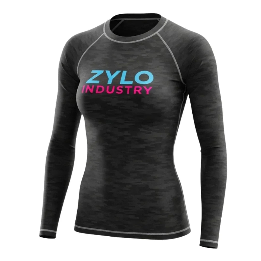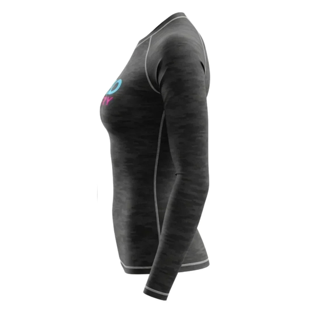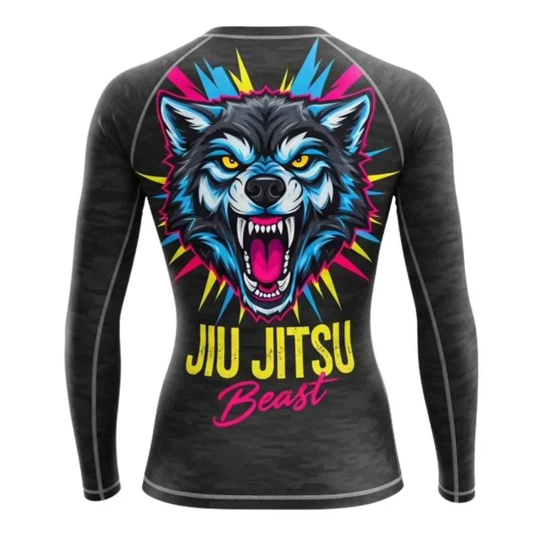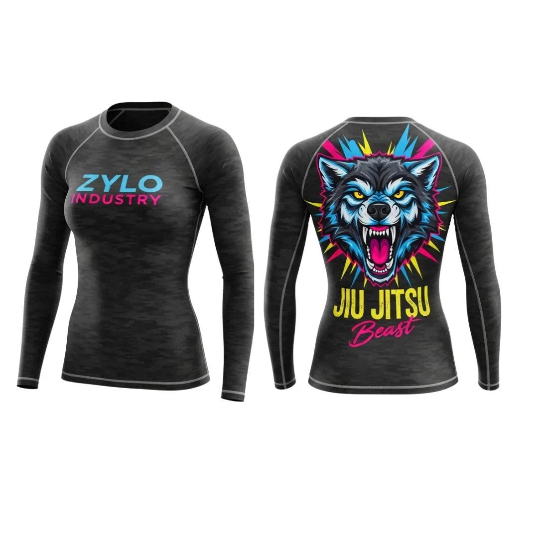 High-quality women’s Jiu Jitsu rash guard with long sleeves, sublimated design, and durable stretch—perfect for martial arts and BJJ training.